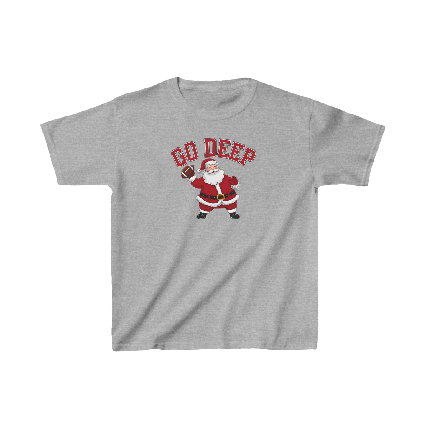 Let the festivities begin—grab your "Go Deep" Santa Kids T-Shirt today and watch your child spread holiday cheer on and off the field!