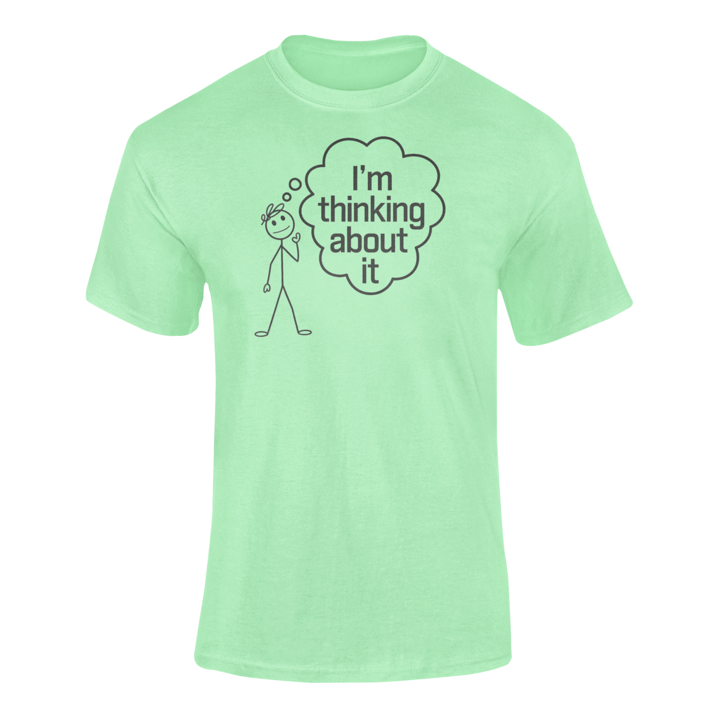 Capture the essence of deep thought (or indecision) with this quirky t-shirt! Featuring a simple yet expressive stickman in a classic "pondering pose" paired with the caption "I'm Thinking About It," this tee is perfect for those who need a moment to figure things outβor just love a good laugh.