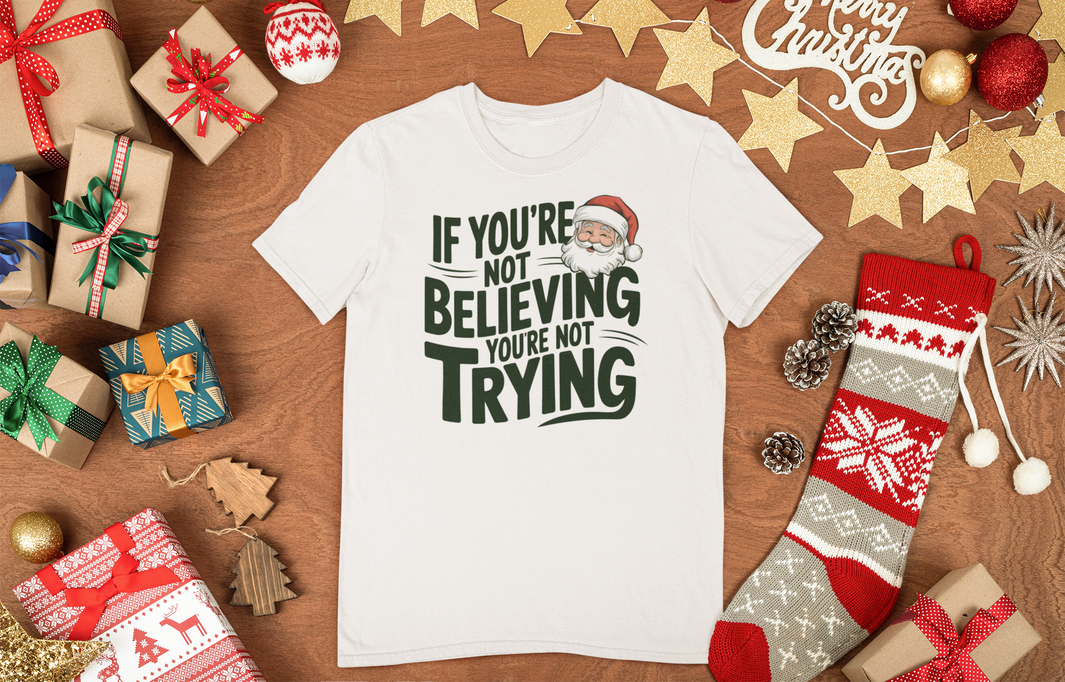 Kids Christmas Shirt|Santa Believers T-Shirt|If You're Not Believing Trying|Funny Holiday Shirt|Santa Claus Gifts