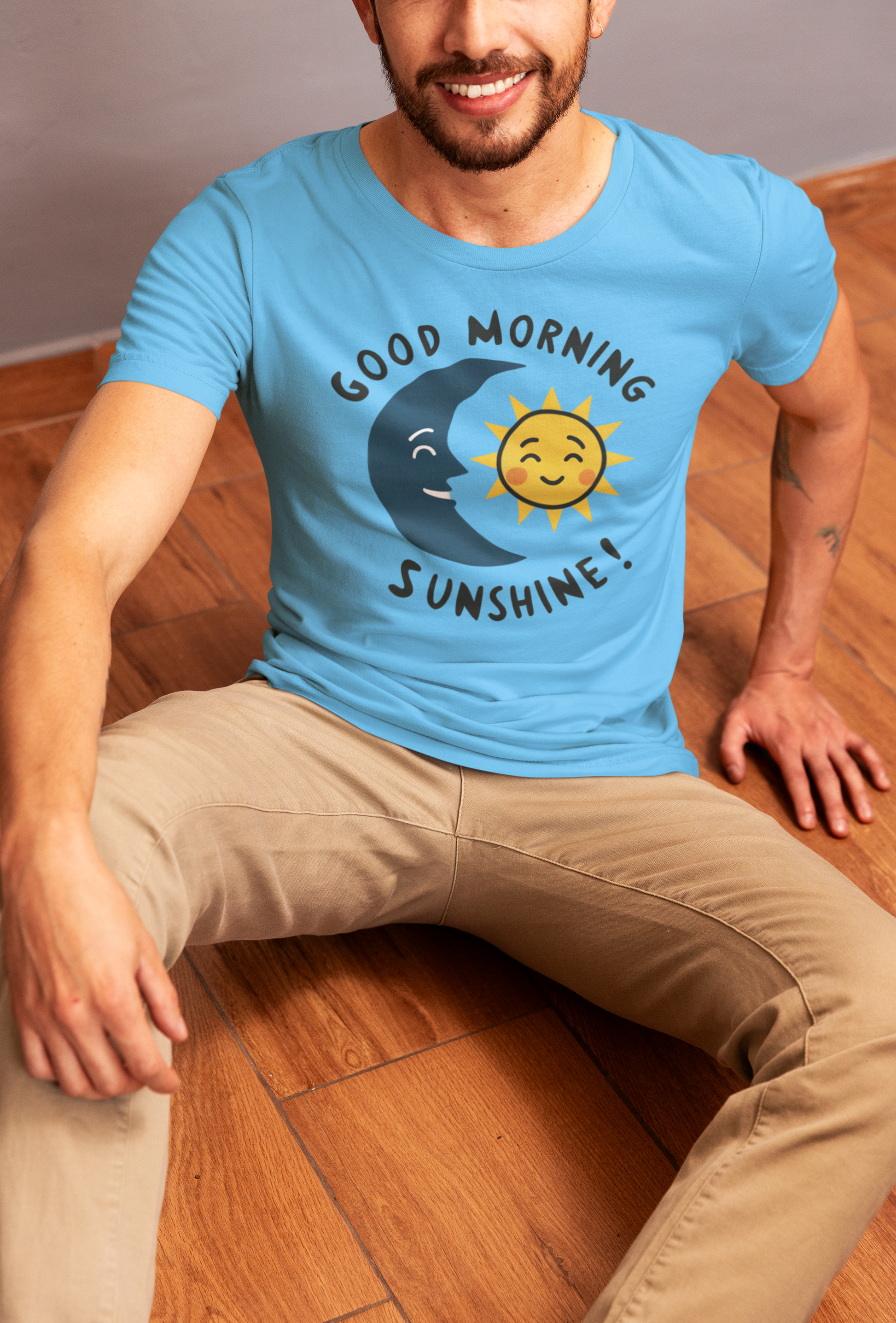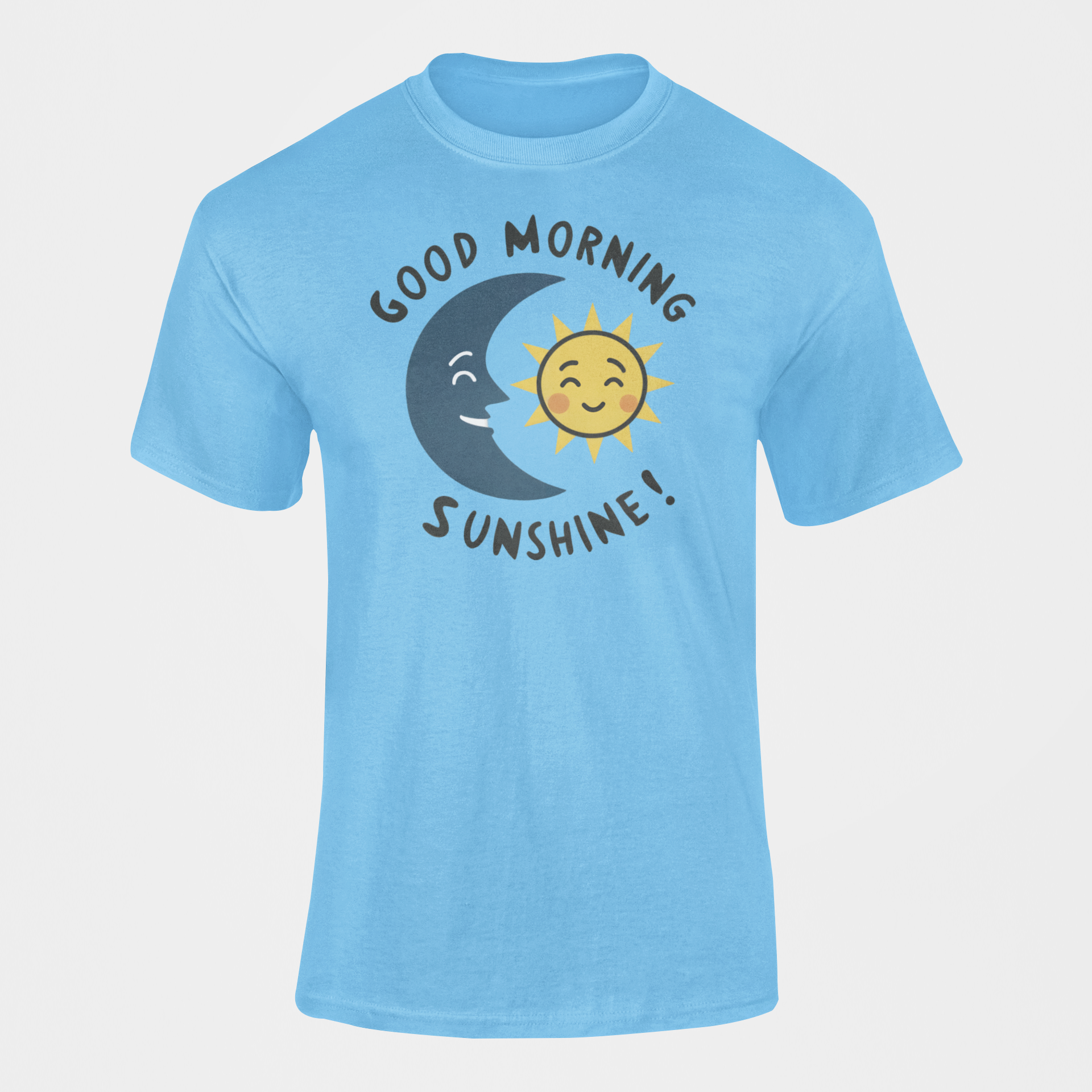 Start your day with a dose of cosmic positivity! This charming t-shirt features the moon warmly greeting the sun, paired with the uplifting caption "Good Morning Sunshine." Perfect for those who love to spread joy and appreciation for life’s simple yet beautiful moments.
