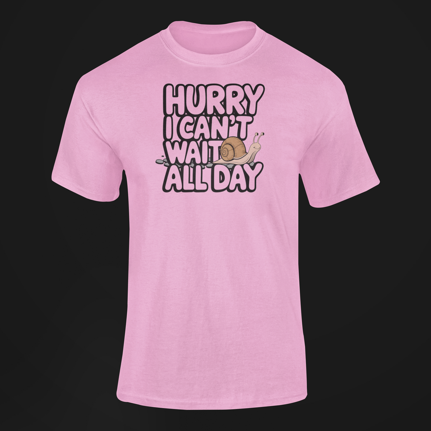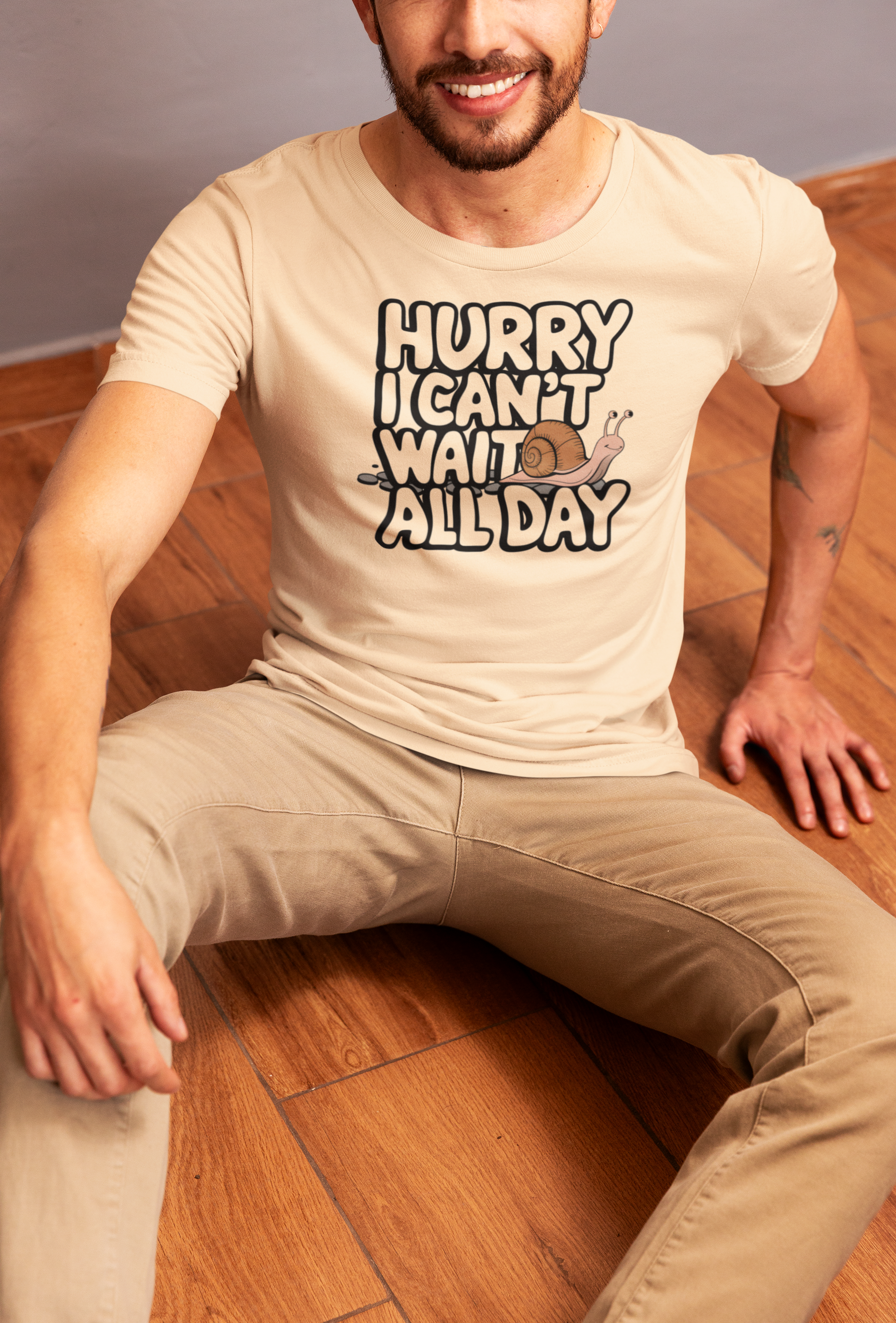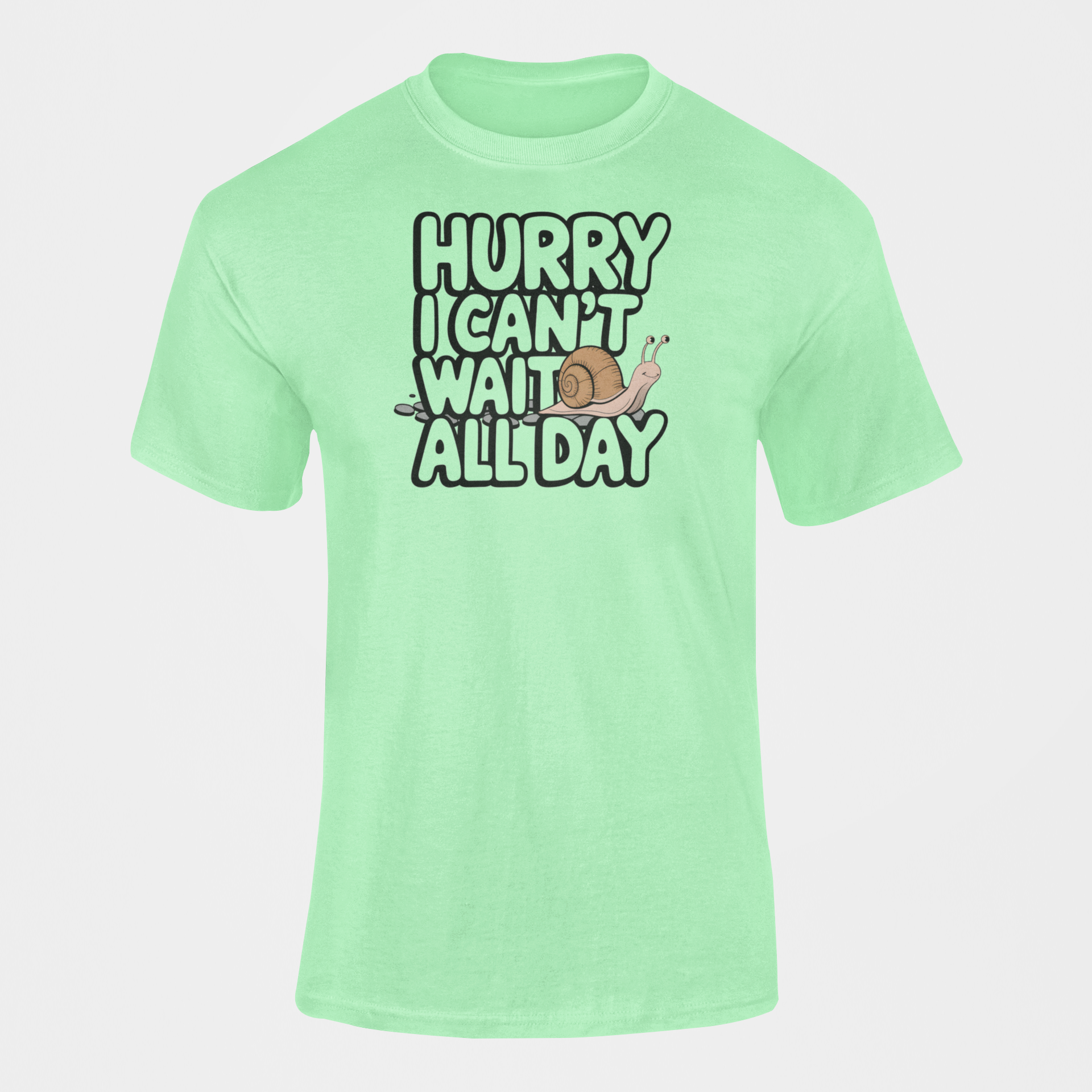 Show off your slow and steady sense of humor with this fun and quirky t-shirt! Featuring an adorable snail illustration paired with the witty caption "Hurry. I Can't Wait All Day," this tee is perfect for anyone who knows how to take life at their own pace.