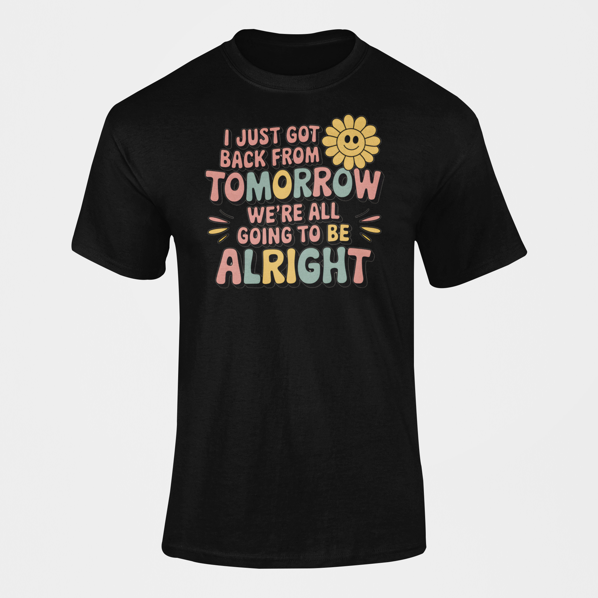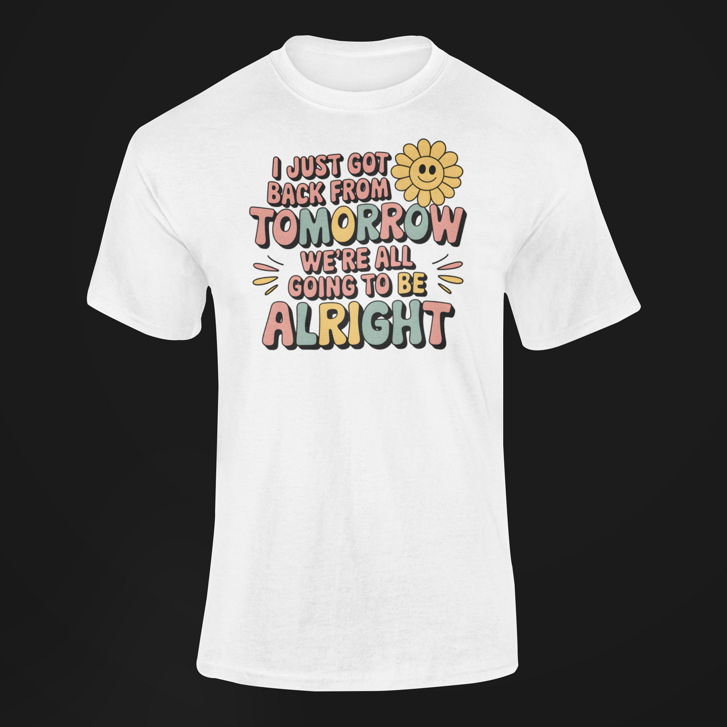 Step into good vibes and futuristic style with our "I Just Got Back From Tomorrow And We're All Going To Be Alright" T-Shirt! This retro-inspired design brings optimism with a groovy twist, perfect for spreading positivity wherever you go.