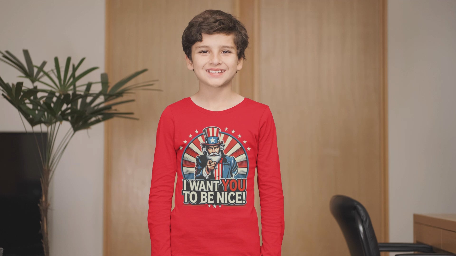 Get your little one ready for the holiday season with our playful and patriotic "I Want You To Be Nice" Youth Sweatshirt! Featuring a cheerful illustration of Santa Claus dressed as Uncle Sam—complete with a star-spangled top hat and a red, white, and blue suit—this sweatshirt combines holiday spirit with a dash of fun.
